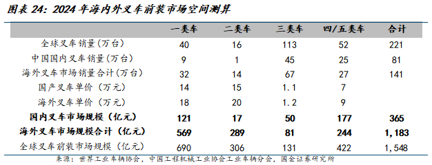 海外叉车市场空间广阔——仅海外叉车前装市场规模约是国内市场的3倍左右。根据我们测算,2024年全球叉车前装市场规模约1548亿元,其中海外市场约1183亿元,国内市场约365亿元;关键假设:(1)参考安徽合力内燃车均价以及中力股份三类车均价,假设国内叉车市场,I类车均价14万元/台,II类车均价15万/台,III类车均价1.1万元/台,四五类车均价为7万元/台。海外市场叉车配置较高,并有品牌溢价,除III类溢价10%外(我国出口居多),其余海外叉车类型单价按高于国内约30%计算。