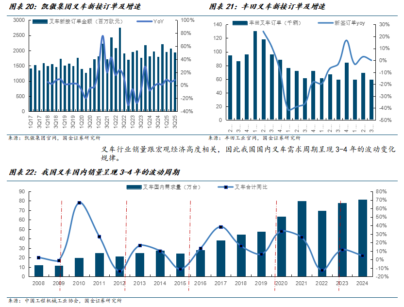 全球订单拐点已现,需求进入上行通道。叉车使用范围相对分散,不易受下游单一行业需求波动影响,需求韧性强。在经历约2年下行期后,2025年全球叉车行业在降息周期与技术升级驱动下呈现结构性复苏。根据WITS,2Q25,欧洲、北美、亚太地区、全球合计叉车新接订单增速分别达2%、17%、17%、12%。龙头公司凯傲集团叉车新接订单从4Q24开始结束长达8个季度的下行期,今年以来订单增速呈现加速趋势。3Q25,凯傲集团叉车订单同比增长17%。丰田工业叉车新接订单从4Q24开始结束长达8个季度的负增长,今年以来总体保持小个位数正增长。