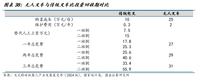 无人叉车经济性已然显现,驱动长期发展。无人叉车不受时间和疲劳限制,能够实现24小时连续运行,大幅提升仓储作业的时效性。并且有效减少对人工叉车司机、拣货员的需求,长期来看人力成本大幅降低。同时,它还能减少因人工操作不当导致的货物破损、设备损耗和安全事故,综合运营成本显著下降。根据我们的测算,通常2-3年即可收回投资。