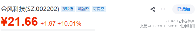 北极星风力发电网获悉:2025年12月29日上午,A股风电板块迎来爆发式上涨,多只个股盘中放量拉升,风电板块整体人气高涨。其中,风电整机龙头金风科技率先强势涨停,涨幅定格在10.01%,股价收于21.66元,领涨板块。在龙头带动下,风电产业链上下游公司纷纷跟涨,呈现普涨格局。