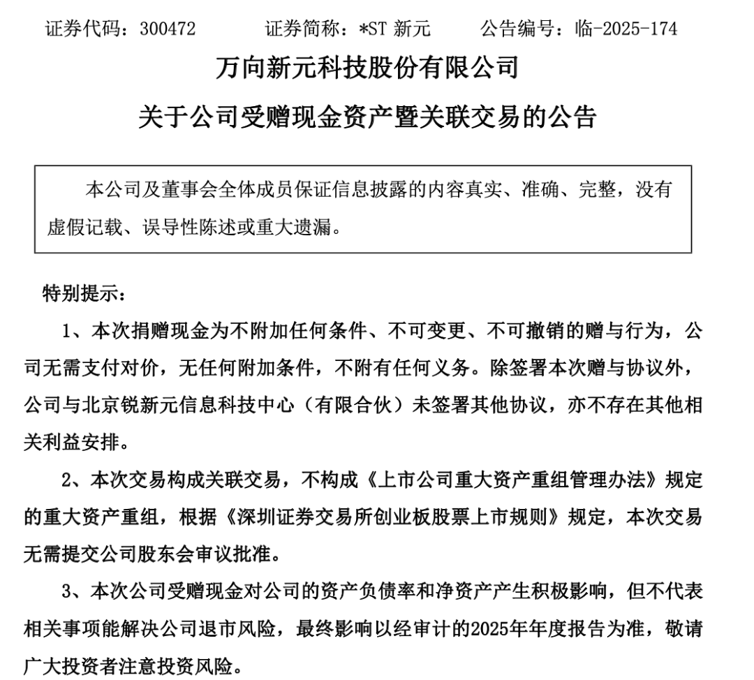 12月26日晚间,*ST新元(维权)公告称,为化解公司退市风险、维持上市公司地位、促进日常生产经营,公司产业投资人北京随锐新元创新科技中心(有限合伙)及随锐科技集团股份有限公司(下称“随锐科技”)拟协调关联方向公司无偿赠与不超过3.3亿元的现金资产。本次赠与以现金资产形式直接投入公司,为无附义务、不可变更、不可撤销的赠与行为,公司无需支付对价,无任何附加条件,不附有任何义务,不会被追索赔偿。