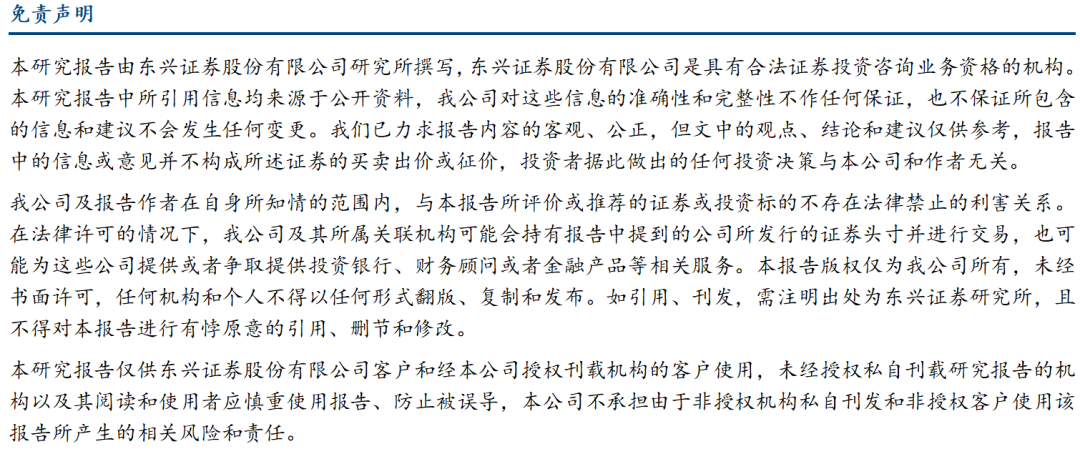 本公众号所载内容仅面向专业机构投资者,任何不符合前述条件的订阅者,敬请订阅前自行评估接受订阅内容的适当性。订阅本公众号不构成任何合同或承诺的基础,本公司不因任何订阅或接收本公众号内容的行为而将订阅人视为本公司客户。因本资料暂时无法设置访问限制,若您并非东兴证券客户中的专业投资者,还请取消关注,请勿订阅、接收或使用本订阅号中的任何信息。我们对由此给您造成的不便表示诚挚歉意,非常感谢您的理解与配合!