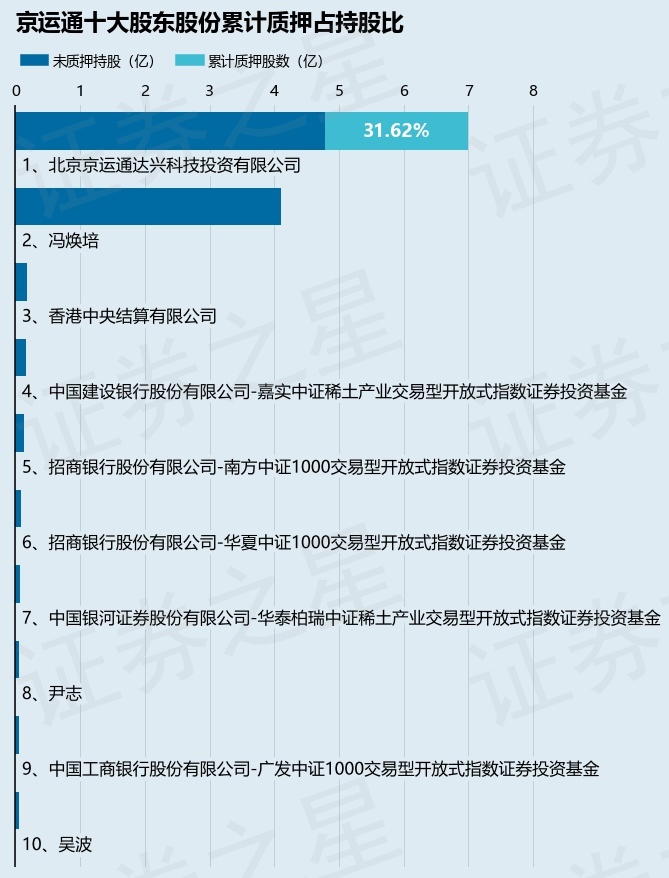 截止本公告日,股东北京京运通达兴科技投资有限公司已累计质押股份2.21亿股,占其持股总数的31.62%。本次质押后京运通十大股东的累计质押股份占持股比例(占持股比例的计算以公司最新一期财务报表公布的十大股东的持股总数为基准)见下图: