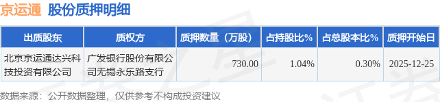 证券之星消息,京运通(601908)12月29日公开信息显示,股东北京京运通达兴科技投资有限公司向广发银行股份有限公司无锡永乐路支行合计质押730.0万股,占总股本0.3%。质押详情见下表: