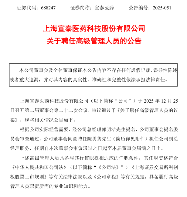 12月25日,宣泰医药发布公告,根据公司实际经营需要,公司总经理郭明洁提名,董事会提名委员会审查通过,决定聘任陈勇隽担任公司副总经理职务,任期自本次董事会审议通过之日起至本届董事会届满之日止。
