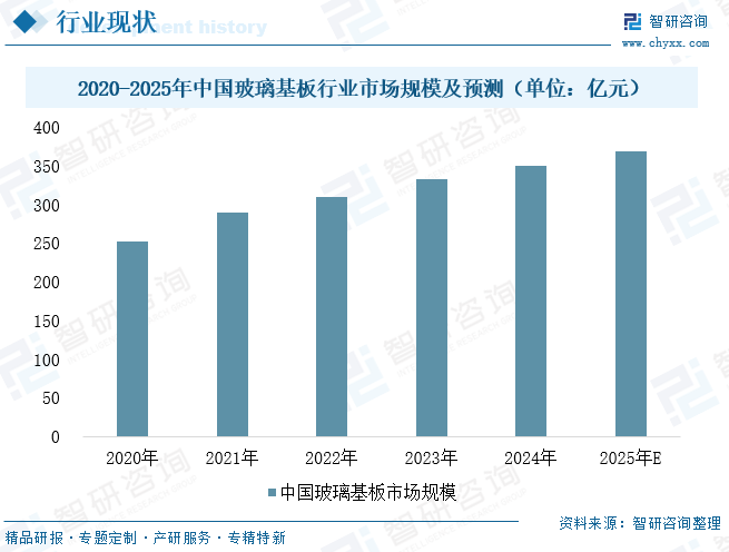玻璃基板作为电子设备显示与半导体封装领域的核心基础材料,具备高平整度、低热膨胀系数、高纯度等关键特性,其性能直接决定显示面板的分辨率、刷新率、对比度等核心指标,并深刻影响芯片封装中的信号传输质量。近年来,随着技术突破与下游应用需求的持续释放,我国玻璃基板行业实现稳步成长,2024年市场规模已达约350亿元,同比增长5.11%。在未来产业升级与国产替代进程进一步深化的推动下,预计2025年行业规模将有望攀升至368亿元,整体呈现稳健增长态势。