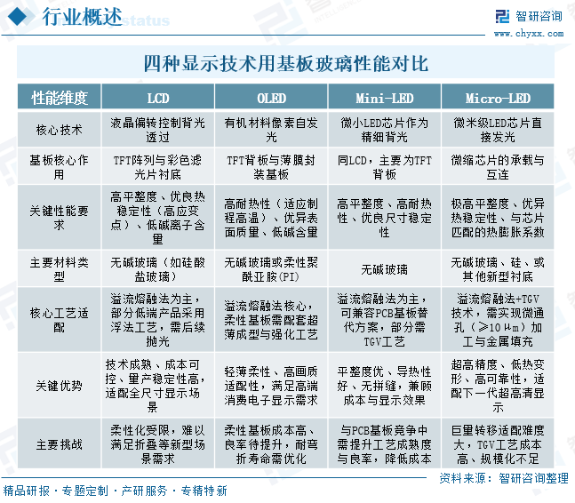 在四种主流显示技术中,LCD基板要求高平整度与高热稳定性的无碱玻璃,且需两片分别用于电路和滤光片;OLED基板尤其关注耐高温性能以应对制程高温,柔性OLED则采用聚酰亚胺(PI)替代传统玻璃;Mini-LED目前主要作为LCD的进阶背光,其基板性能要求与高档LCD基板基本一致;而Micro-LED作为前沿技术,对基板的平整度、热稳定性和热膨胀系数匹配要求最为严苛,以应对极高的芯片转移与封装精度挑战。