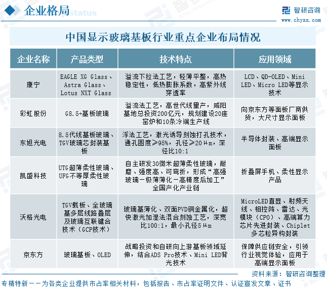 当前,显示玻璃基板领域重点企业技术布局呈现差异化竞争:康宁依托溢流下拉法工艺,提供覆盖LCD、OLED及新型显示技术的高性能基板;彩虹股份与东旭光电分别通过溢流法、浮法工艺实现G8.5+高世代线国产化突破,东旭光电更以激光刻蚀技术切入半导体封装领域;凯盛科技自主研发30微米超薄柔性玻璃,构建UTG/UFG全产业链,主攻折叠屏市场;沃格光电凭借TGV载板与玻璃基多层线路技术,在MicroLED、光模块及先进封装领域形成技术壁垒;京东方则通过战略投资与自研向上游延伸,结合ADS Pro、Mini LED等显示技术强化供应链自主性,共同推动行业向高世代、柔性化及多元化应用方向演进。