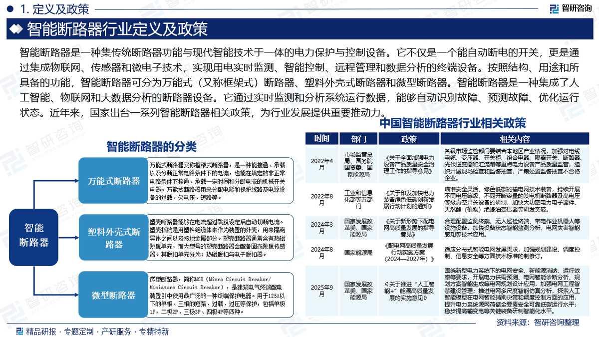 行业相关政策:智能断路器是一种集成了人工智能、物联网和大数据分析的断路器设备。它通过实时监测和分析系统运行数据,能够自动识别故障、预测故障、优化运行状态。近年来,国家出台一系列智能断路器相关政策,为行业发展提供重要推动力。例如,2022年8月,工业和信息化部等五部门印发《关于印发加快电力装备绿色低碳创新发展行动计划的通知》,瞄准安全灵活、绿色低碳的输电网技术装备,持续开展不同电压等级、不同开断容量的发电机断路器及高电压等级真空开关设备的研制,加快大功率电力电子器件、天然酯(植物)绝缘油变压器等研发突破。2025年9月,国家发展改革委、国家能源局印发《关于推进“人工智能+”能源高质量发展的实施意见》,围绕新型电力系统下的电网安全、新能源消纳、运行效率等要求,开展电力供需预测、电网智能诊断分析、规划方案智能生成等电网规划设计应用,加强电网工程智慧建设管理;推进电网多尺度智能仿真分析,探索人工智能模型在电网智能辅助决策和调度控制方面的应用,提升电力系统源网荷储全要素安全可靠低碳运行水平;稳步提高输变电等关键装备研制智能化水平。