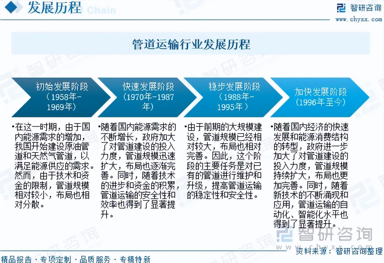 管道运输行业的发展经历了四个阶段,主要包括1958年-1969年的初始发展阶段、1970年-1987年的快速发展阶段、1988年-1995年的稳步发展阶段和1996年至今的加快发展阶段。在初始发展阶段,由于国内能源需求的增加,我国开始建设原油管道和天然气管道,以满足能源供应的需求。然而,由于技术和资金的限制,管道规模相对较小,布局也相对分散。在快速发展阶段,随着国内能源需求的不断增长,政府加大了对管道建设的投入力度,管道规模迅速扩大,布局也逐渐完善。同时,随着技术的进步和资金的积累,管道运输的安全性和效率也得到了显著提升。在稳步发展阶段,由于前期的大规模建设,管道规模已经相对较大,布局也相对完善。因此,这个阶段的主要任务是对已有的管道进行维护和升级,提高管道运输的稳定性和安全性。在加快发展阶段,随着国内经济的快速发展和能源消费结构的转型,政府进一步加大了对管道建设的投入力度,管道规模持续扩大,布局也更加完善。同时,随着新技术的不断涌现和应用,管道运输的自动化、智能化水平也得到了显著提升。
