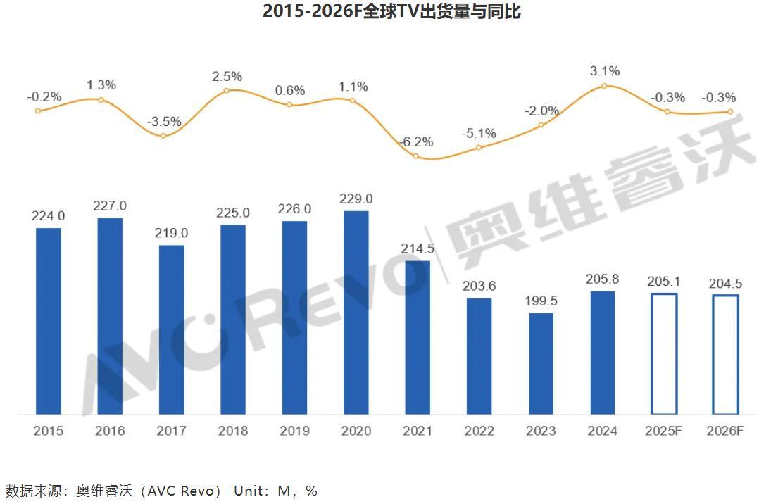 据调研机构奥维睿沃近日发布的《2026年TV整机市场十大趋势预测》,2015-2025年,全球电视出货量高峰为2020年的2.29亿台,2024年已回落至2.058亿台,2025年则为2.051亿台,同比下滑0.3%;2025年第四季度以来,存储芯片的价格上涨影响了电视行业,2026年“世界杯”赛事对电视市场的拉动作用或不敌存储涨价的负面影响,全球电视出货量将进一步下滑至2.045亿台,同比下降0.3%。