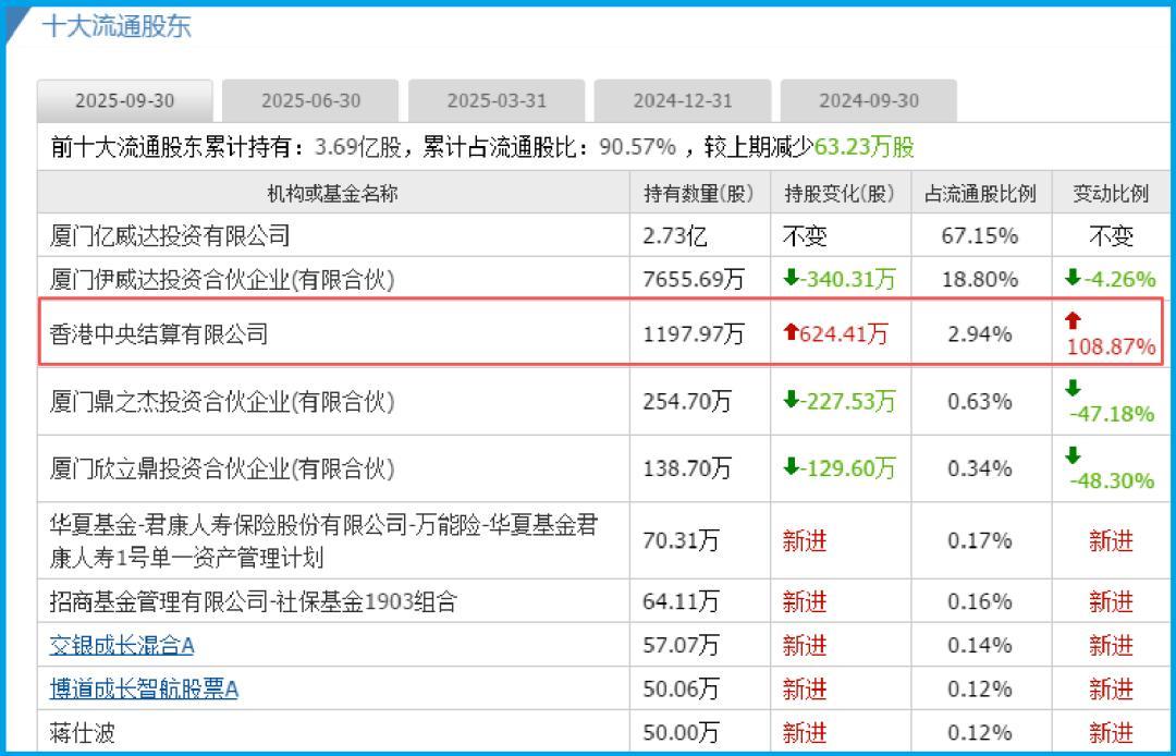 此时,一股强大的外部力量介入现场:香港中央结算有限公司(北向资金)持仓暴增109%。
