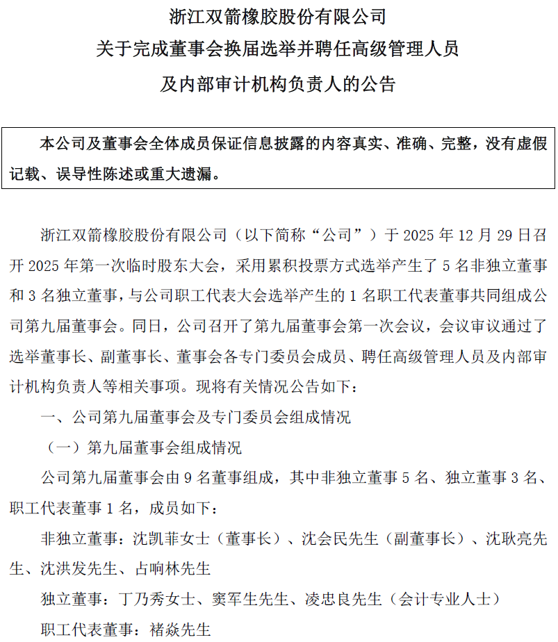 根据公告,双箭股份于2025年12月29日召开临时股东大会,选举产生了新一届董事会成员。公司第九届董事会由9名董事组成,沈凯菲当选为董事长,沈会民任副董事长兼总经理,沈耿亮等任非独立董事。与此同时,公司聘任了包括副总经理、财务总监、董事会秘书等在内的高级管理人员及内部审计机构负责人。