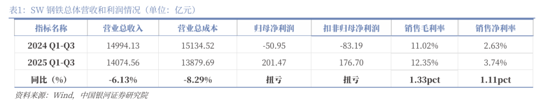 盈利能力显著改善,成本管控见成效。2025年Q1-Q3,SW钢铁板块营业总收入14074.56亿元,同比下降6.13%,营业成本为13879.69亿元,同比下降8.29%,收入降幅小于成本降幅2.16个百分点。2025前三季度板块实现归母净利润达201.47亿元,扣非归母净利润176.70亿元,相比去年同期均实现扭亏为盈。前三季度行业平均销售毛利率为12.35%,同比提升1.33个百分点;销售净利率为3.74%,同比提升1.11个百分点。成本管控效率提升叠加行业供需结构改善,推动板块盈利水平显著回升。