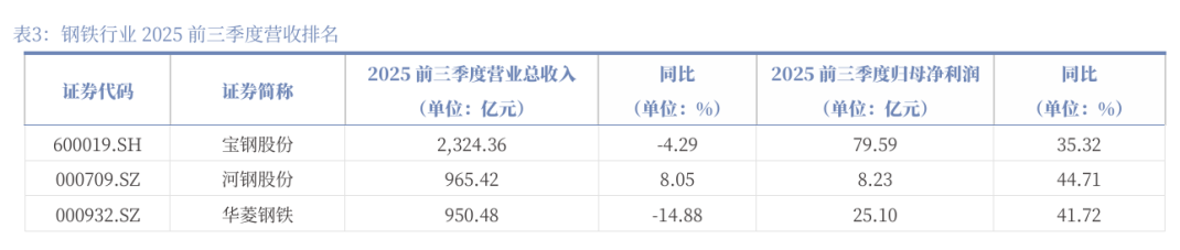 龙头营收规模稳定,盈利修复节奏领先。2025年前三季度,钢铁龙头企业营收规模优势突出:宝钢股份以2324.36亿元的营业总收入位居第一,同比微降4.29%,实现归母净利润79.59亿元,同比增加35.32%;河钢股份和华菱钢铁分别以965.42亿元、950.48亿元紧随其后,分别实现归母净利润8.23亿元(同比+44.71%)、25.10亿元(同比+41.72%)。盈利端展现出较强弹性:首钢股份归母净利润达到9.53亿元,同比大幅增长368.13%,头部企业依托规模化生产的成本摊薄效应,叠加精细化成本管控措施,实现盈利能力修复。