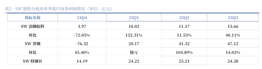 从细分板块盈利贡献来看,二级子行业中,SW普钢利润总额占比最高,25Q3占比约为58.38%;SW特钢Ⅱ利润总额占比约24.98%;SW冶钢原料利润总额占比约16.64%。SW普钢利润总额占比居首,其修复节奏对板块整体盈利的影响更为突出。从盈利修复节奏来看,SW普钢板块的修复速度最为显著,25Q3实现归母净利润47.12亿元,环比增长14.03%;25Q2实现归母净利润41.32亿元,环比增长104.89%。SW冶钢原料也保持盈利增长,25Q3实现归母净利润15.66亿元,环比增长40.11%。