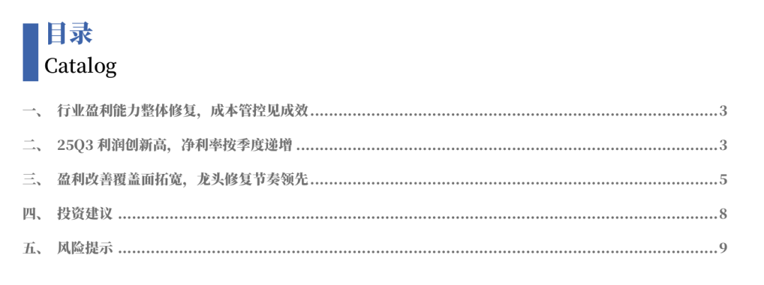 钢铁行业盈利能力显著改善,成本管控见成效。需求侧地产步入调整期,新基建、新能源等制造用钢的兴起,支撑板材与特钢景气,行业集中度稳步提升;供给侧反内卷政策加码,工信部印发《钢铁行业稳增长工作方案(2025—2026年)》,提出2025—2026年钢铁行业增加值年均增长4%左右,出清有序推进。建议关注:(1)品种结构不断优化,持续稳定的高分红子行业龙头;(2)高技术壁垒对抗“内卷”,业绩与估值修复空间显著可期;(3)中长期供给格局改善的上游资源品。