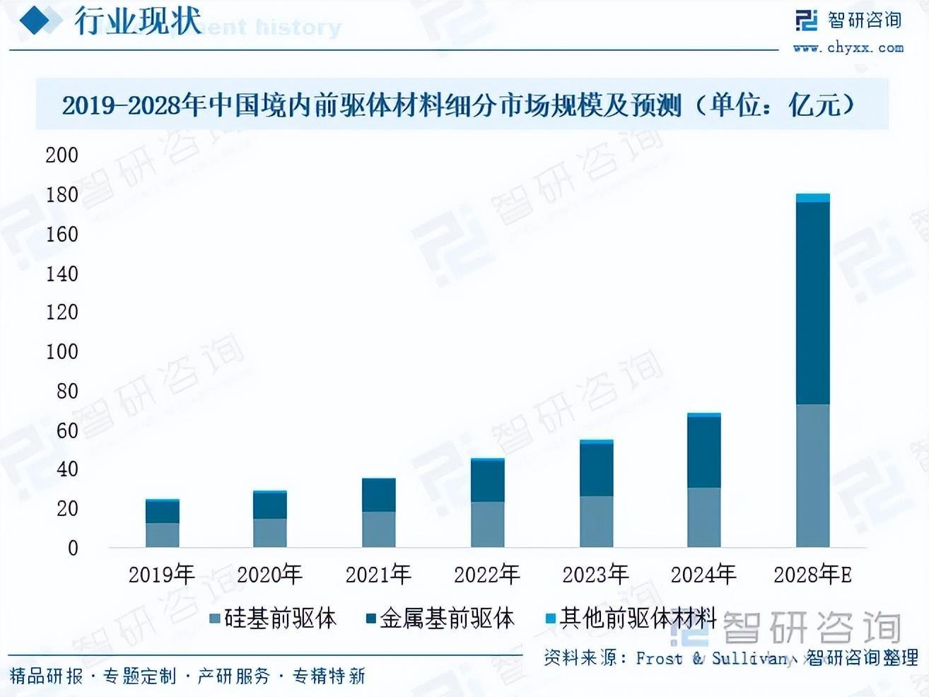 从材料体系看,我国前驱体市场主要由硅基前驱体和金属基前驱体构成,二者增长逻辑各异。硅基前驱体主要服务于半导体氧化硅、氮化硅薄膜制备及光伏产业,需求稳健,2024年市场规模为30.6亿元,同比增长19.5%,预计到2028年将达到72.6亿元,年复合增长率为24%。而金属基前驱体则直接受益于逻辑芯片、存储芯片等半导体先进制程的快速普及与国产化需求,增长动能更为强劲,2024年市场规模约35.5亿元,预计到2028年将攀升至103.4亿元,年复合增长率高达30.6%,成为驱动行业增长的主引擎。此外,陶瓷、生物前驱体等小众品类目前市场规模较小,但作为技术储备与补充,同样不可或缺。