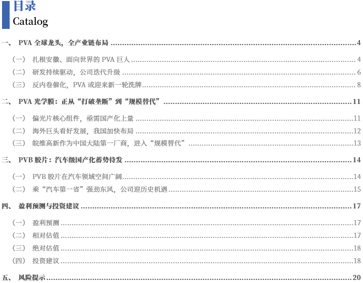 汽车级PVB胶片迎来量产元年:PVB胶片是夹层安全玻璃最佳粘合材料,具备安全、节能、隔音等优势。由于长期以来国产PVB胶片的质量较日美进口产品品质上有差距,只能用于建筑、光伏领域。公司凭借“PVA-PVB树脂-PVB胶片”原料一体化优势,持续瞄准具有更高附加值的汽车级PVB胶片的技术开发。随着皖维集团汽车玻璃项目投产,公司助力皖维集团打通"PVA树脂-PVB树脂-PVB汽车胶片-汽车安全玻璃"全产业链,开启汽车安全玻璃生产新赛道蓝海征程。