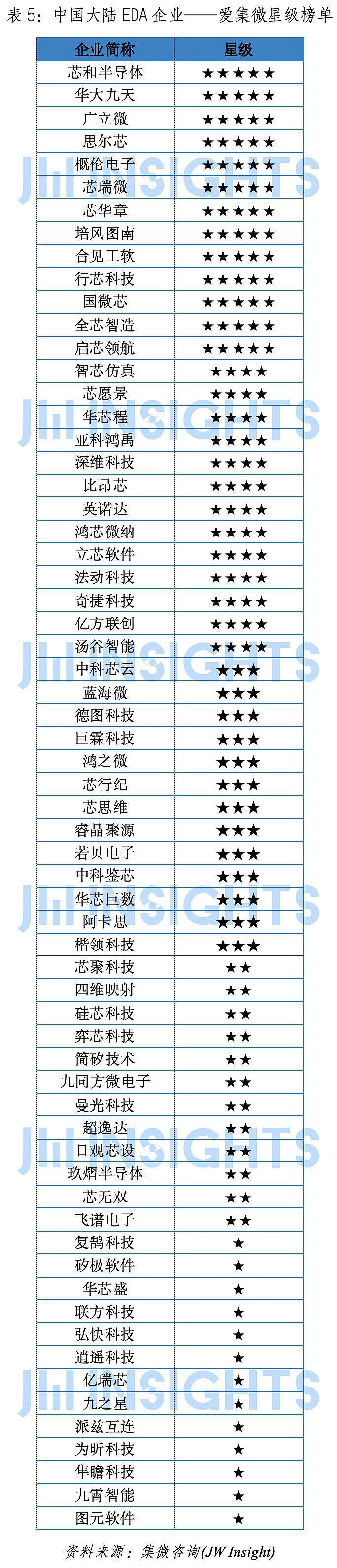 最后,爱集微知识产权咨询针对中国大陆EDA企业,在综合考虑专利数量、发明专利占比、授权专利与有效专利占比、专利海外布局、被引用比例、专利诉讼、专利转让、专利许可、专利质押、专利撰写水准等指标,进行专利实力星级评价,结果如下。