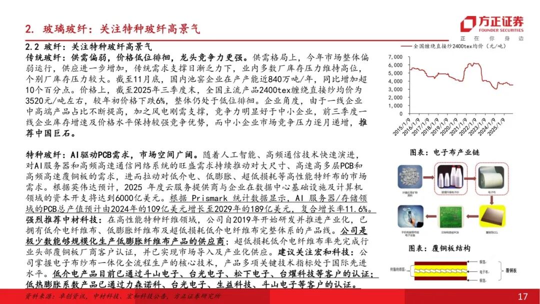 玻璃玻纤:关注特种玻纤高景气。玻璃方面,2025年浮法玻璃行业整体呈现供需僵持、量价双弱、盈利探底的态势。预计2026年浮法玻璃行业的主旋律将转向供给优化,核心博弈点在于极致亏损下的产能出清幅度,推荐旗滨集团。玻纤方面,传统玻纤供需偏弱,价格低位徘徊,龙头竞争力更强,推荐中国巨石。AI驱动PCB需求,特种玻纤市场空间广阔,强烈推荐中材科技:公司是极少数能够规模化生产低膨胀纤维布产品的供应商;超低损耗低介电纤维布率先完成行业头部覆铜板厂商客户认证,并已实现市场导入及产业化供应。建议关注宏和科技:公司掌握电子布纱布一体化全流程生产的核心技术,产品多项关键技术指标处于国际先进水平。低介电产品目前已通过斗山电子、台光电子、松下电子、台燿科技等客户的认证。