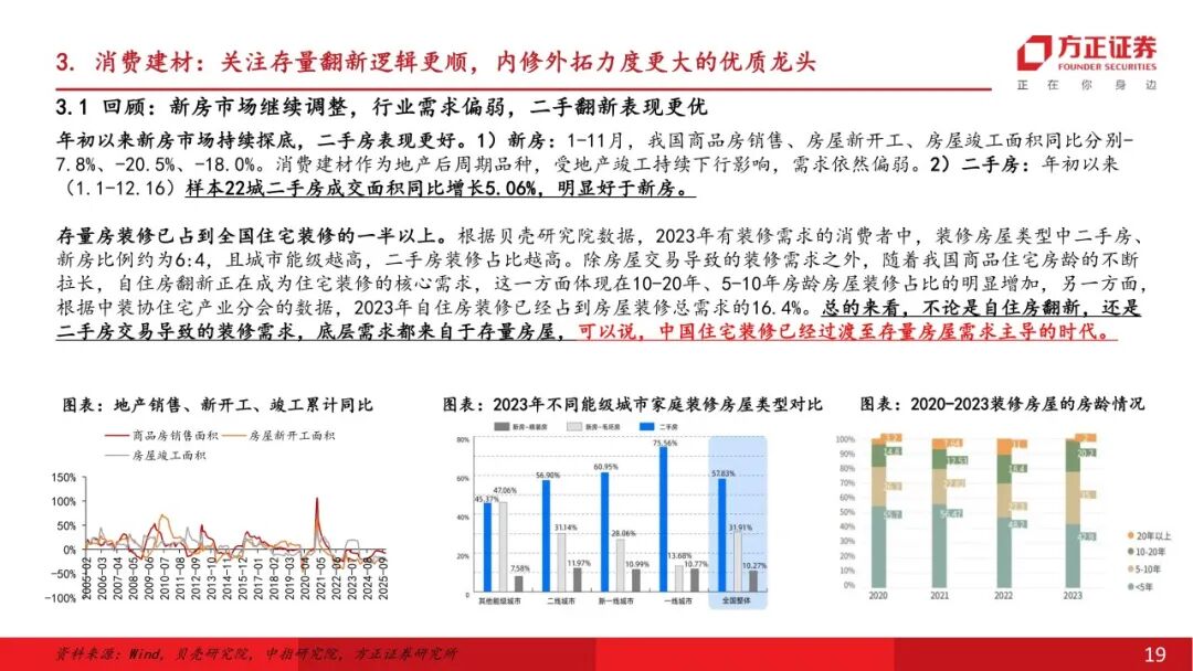 消费建材:关注存量翻新逻辑更顺,内修外拓力度更大的低估值优质龙头。2025年新房市场继续调整,行业需求偏弱,二手翻新表现更优,存量房装修已占到全国住宅装修的一半以上,翻新市场空间广阔。首先关注存量翻新更加受益的品类,如涂料、管材等。其次,关注持续内修外拓的优质企业,内修方面,重视风险持续出清、市占率较高、安全垫稳固的低估值龙头。外拓方面,重视品类拓展、跨界转型、区域拓展(海外)三类企业。总之,推荐三棵树、东方雨虹、北新建材、伟星新材,建议关注科达制造。