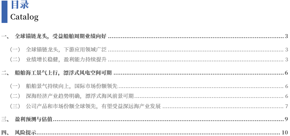 全球锚链龙头,下游应用领域广泛。公司是专业化从事船用锚链、海洋系泊链和矿用链的生产企业,是我国船用锚链、海洋平台系泊链生产和高强度矿用链生产基地。公司主要产品包括船用锚链和附件、海洋平台系泊链及其配套附件和高强度矿用链条及其配套附件,⼴泛应⽤于海洋⽯油平台、海上⻛电、海洋牧场、船舶、煤矿等领域。