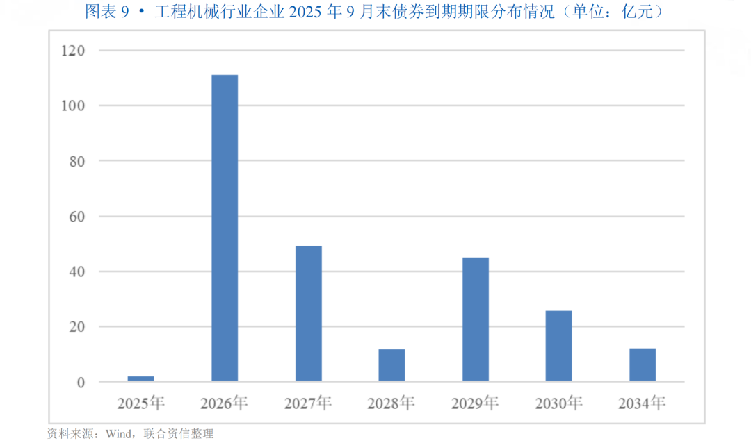 从具体企业看,徐工机械2026年到期信用债券103.54亿元,截至2025年9月底,徐工机械拥有货币资金224.54亿元,期末现金及现金等价物余额179.71亿元,能够覆盖到期债券余额;中联重科2026年到期信用债券7.70亿元,截至2025年9月底中联重科货币资金(137.63亿元)能够覆盖到期债券余额。