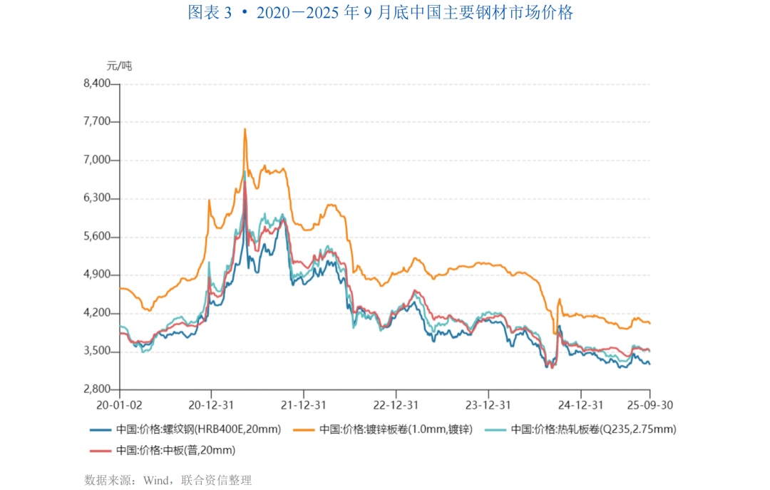 从供应端看,工程机械行业的上游主要是钢、铁、液压件以及发动机等原材料与核心零部件。根据中商产业研究院数据,钢材约占工程机械成本的30%。钢、铁价格的涨跌直接影响到工程机械制造企业的生产成本,进而影响工程机械制造企业的盈利能力。2025年前三季度,中国钢材价格整体呈现“波动下行”的发展态势,成本下降有助于改善工程机械企业毛利率。截至2025年9月底,中国螺纹钢(型号:HRB400E,20mm)、镀锌板卷(型号:1.0mm镀锌)、热轧板卷(型号:Q235,2.75mm)和中板(型号:普20mm)的市场价格分别为3260元/吨、4003元/吨、3496元/吨和3519元/吨,较2024年9月底分别下降17.20%、7.49%、8.27%和6.31%,主要原材料成本压力有所缓解。