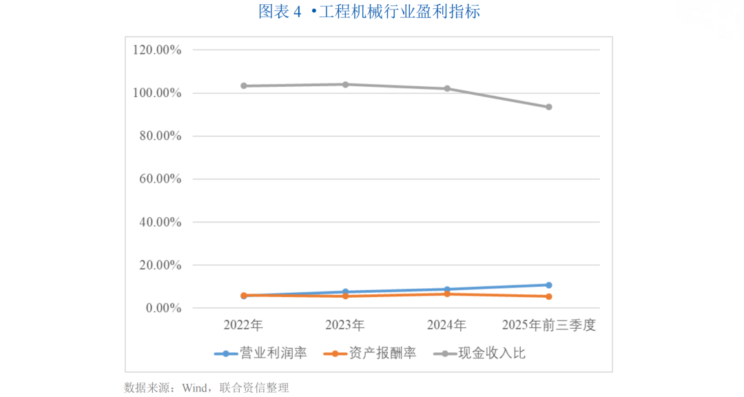 2025年以来,工程机械行业呈现稳健向好的发展态势。受益于国内存量设备更新需求的集中释放,和海外市场的持续发力,2025年前三季度,工程机械行业主要上市企业合计营业总收入同比增长11.27%,利润总额同比增长23.87%,实现较高增速;营业利润率持续上升,从2022年的5.67%提升至2025年前三季度的10.74%,整体盈利能力逐年增强,反映了行业增长的积极信号;行业资产报酬率相对稳定,2025年前三季度达到5.48%。2022-2024年,工程机械行业现金收入比均保持在100%以上,销售收入现金回收情况良好,2025年前三季度略有下降,但仍保持较高水平。