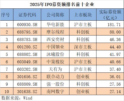 融资规模方面,2025年116家IPO企业合计募集资金净额约为1317.71亿元,与2024年的673.53亿元相比,增长了95.63%。分板块来看,沪深两市主板、科创板仍是A股IPO市场的募资主力。根据Wind数据,2025年A股IPO募资金额排名前十的企业中,3家来自沪市主板、1家来自深市主板,其中,沪市主板企业华电新能凭借181.71亿元的首发募集金额,排名第一;4家来自科创板,分别是摩尔线程、西安奕材、沐曦股份和强一股份;2家来自创业板,分别是联合动力和南网数字。北交所26家IPO企业合计募资仅75.3亿元,平均募资额约2.9亿元,这与其服务创新型中小企业的市场定位与融资特点有关。