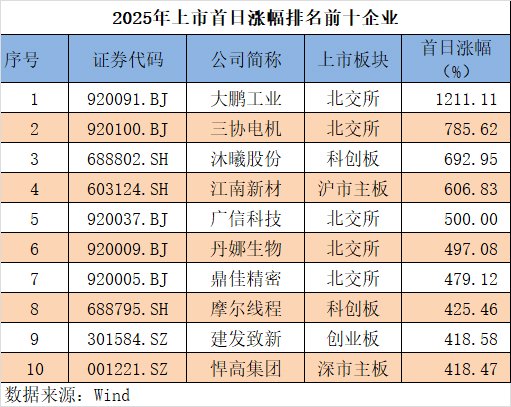从上市首日的表现来看,116只新股上市首日均上涨,平均涨幅259%,市场赚钱效应显著。在上市首日涨幅排名前十的新股中,北交所占了一半,大鹏工业上市首日涨幅高达1211%,位居榜首,同时也创下了北交所新股首日涨幅新纪录;科创板2025年首日涨幅最高的新股是沐曦股份和摩尔线程,首日涨幅分别为693%和425%,摩尔线程同时也是2025年首发上市价格最高的新股,每股定价为114.82元。
