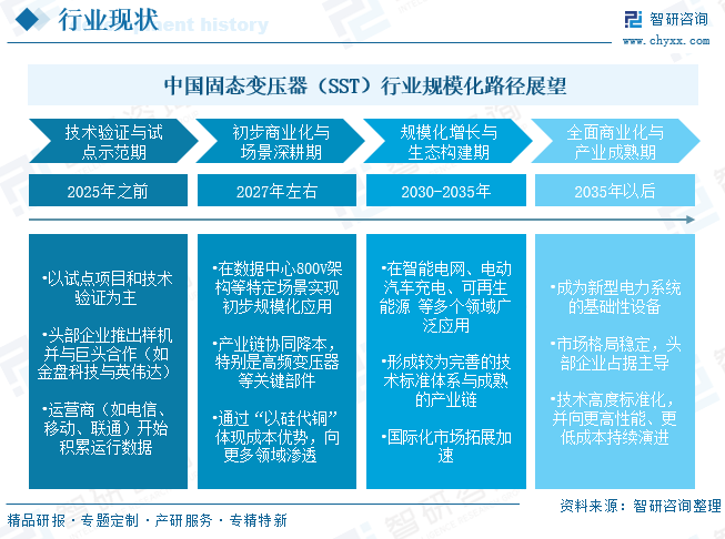中国固态变压器行业正迎来从技术验证向规模化商用转变的关键发展阶段。未来,行业将围绕上游核心材料国产化与技术协同持续突破,通过模块化设计与高频拓扑优化推动成本下降与性能提升;应用场景将从当前的数据中心、智能电网等核心领域,逐步向电动汽车超充、工业变频、轨道交通等多元市场纵深拓展,形成由试点示范到规模化落地的清晰路径;产业格局更将呈现“国企主导重大工程、民企专注技术创新、上下游协同发展”的生态体系,在标准完善、热管理技术成熟与供应链自主可控的共同推动下,行业有望实现高质量规模化发展,成为支撑新型电力系统与数字化基础设施建设的重要力量。具体发展趋势如下: