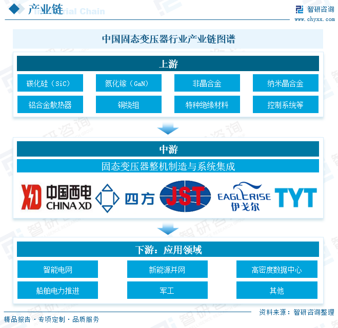 中国固态变压器(SST)行业已形成层次分明的垂直产业链结构。上游以碳化硅(SiC)、氮化镓(GaN)等宽禁带半导体器件以及非晶、纳米晶软磁材料为核心,技术壁垒高、产业附加值集中,天科合达、斯达半导等国内企业正加快国产化进程,逐步缓解关键环节的供应链风险;中游聚焦整机集成与模块化制造,金盘科技、四方股份等本土龙头凭借成本控制与技术转化能力持续追赶国际厂商,产业资源进一步向长三角、珠三角等配套成熟区域集聚,市场集中度不断提升;下游应用以智能电网、新能源并网与高密度数据中心为主力场景,在“东数西算”工程和新型电力系统建设等政策推动下,轨道交通、船舶电力等新兴领域也在加速渗透。整体产业链正朝着上游材料自主化与下游应用多样化持续深化发展。
