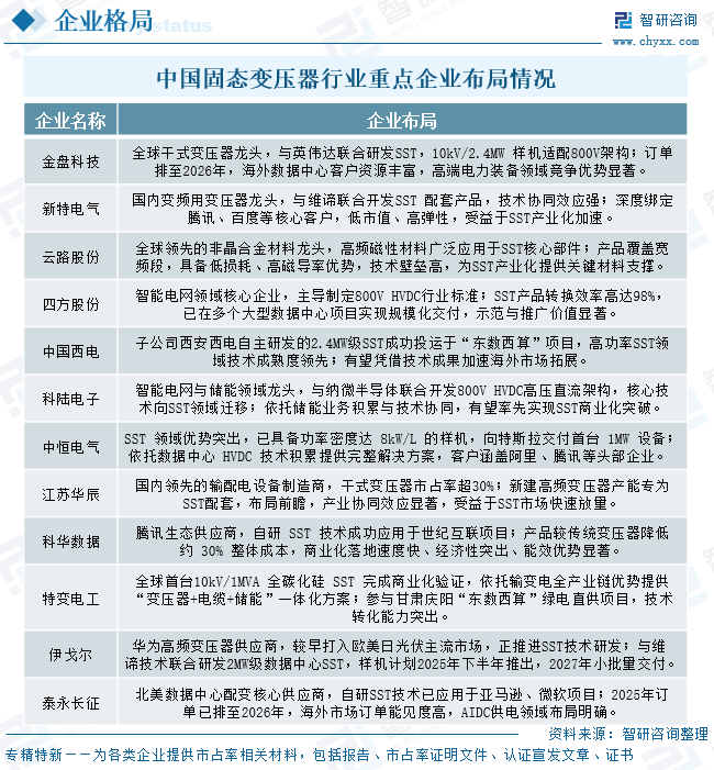固态变压器行业技术壁垒较高,尽管国内外企业均已展开技术探索,但目前产业化程度仍然有限。从国内企业布局来看,已形成“国企主导、民企创新、配套协同”的多元生态,头部效应持续增强,国产化替代进程加快。国有企业中,中国西电凭借2.4MW级SST的规模化应用占据国内高端市场60%以上份额;特变电工依托全产业链优势推出全球首台全碳化硅SST,并落地雄安新区、“东数西算”等国家重大工程。民营企业方面,金盘科技与英伟达联合研发适配800V架构的SST,订单已排产至2026年;科陆电子、科华数据等企业依托储能或数据中心技术积累实现商业化突破;新特电气、泰永长征则通过深度绑定头部科技企业展现出高业务弹性。与此同时,上游材料与配套体系日趋完善,云路股份、安泰科技等为企业提供核心磁性材料,铭普光磁作为纳微半导体独家供应商深度参与800V架构建设。整机企业与上下游正协同发力,共同推动行业从技术验证向规模化商用加速迈进。