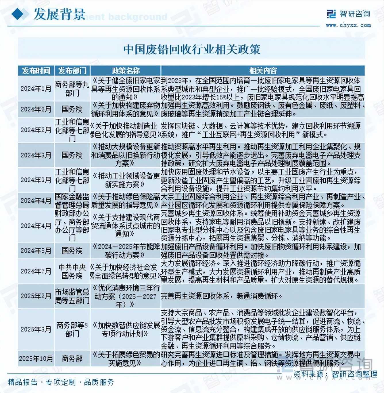 我国高度重视包括废铅回收在内的再生资源回收产业发展,相继发布《关于健全废旧家电家具等再生资源回收体系的通知》《关于加快构建废弃物循环利用体系的意见》《关于加快推动制造业绿色化发展的指导意见》《推动大规模设备更新和消费品以旧换新行动方案》《推动工业领域设备更新实施方案》《关于推动绿色保险高质量发展的指导意见》《关于支持建设现代商贸流通体系试点城市的通知》《2024—2025年节能降碳行动方案》《关于加快经济社会发展全面绿色转型的意见》《优化消费环境三年行动方案(2025—2027年)》《加快数智供应链发展专项行动计划》《关于拓展绿色贸易的实施意见》等一系列政策支持、鼓励行业发展,为我国废铅回收行业发展提供了良好的政策环境。