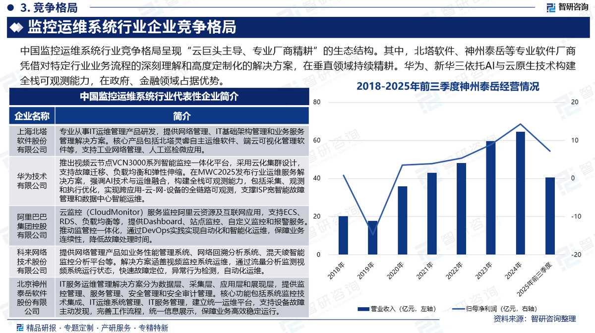 竞争情况:中国监控运维系统行业竞争格局呈现"云巨头主导、专业厂商精耕"的生态结构。其中,北塔软件、神州泰岳等专业软件厂商凭借对特定行业业务流程的深刻理解和高度定制化的解决方案,在垂直领域持续精耕。华为、新华三依托AI与云原生技术构建全栈可观测能力,在政府、金融领域占据优势;阿里云、腾讯云等云厂商通过SaaS化监控服务切入中小企业市场,实现弹性部署与成本优化。