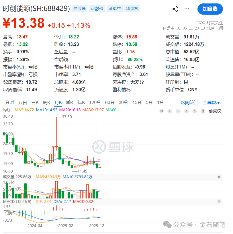 金石杂谈查询发现,时创能源是一家光伏企业,总市值53亿,主要做光伏设备和电池。2025年前三季度公司实现营业收入7.05亿元,同比+54.3%;归母净利润-2.54亿元,扣非归母净利润为-2.69亿元,亏损同比均大幅收窄。