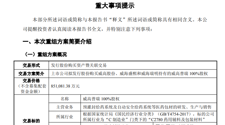 交易完成后,威高普瑞将成为威高血净全资子公司,主营业务将新增医药包材相关业务。