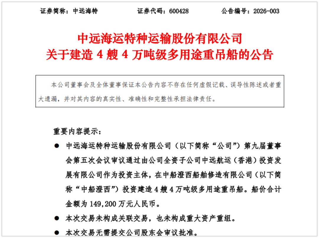 2025年12月31日,中远海运特种运输股份有限公司(中远海特,600428)发布公告称,公司董事会已审议通过新造船投资方案:由全资子公司中远航运(香港)投资发展有限公司作为投资主体,在中船澄西船舶修造有限公司投资建造4艘4万吨级多用途重吊船,合同船价合计149,200万元人民币(约14.92亿元)。