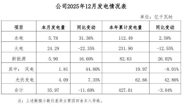 北极星电力网获悉,1月6日,湖北能源披露2025年发电情况,2025年12月,公司完成发电量35.97亿千瓦时,同比减少11.69%。其中水电发电量同比增加31.36%,火电发电量同比减少22.35%,新能源发电量同比增加16.60%。