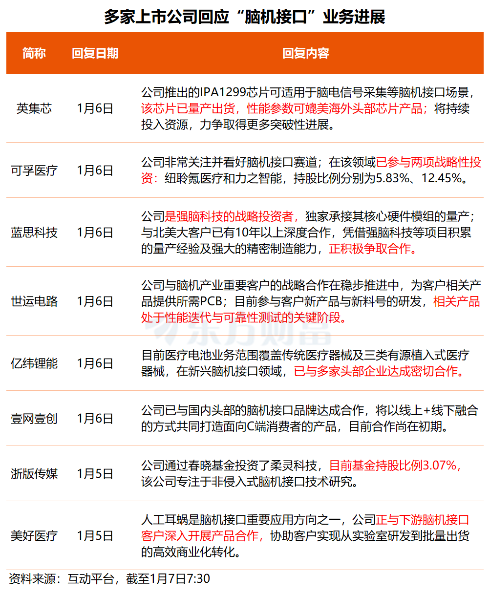 受马斯克“量产预告”消息刺激,脑机接口概念连日大涨,多家上市公司也在互动平台针对相关提问进行了回复。