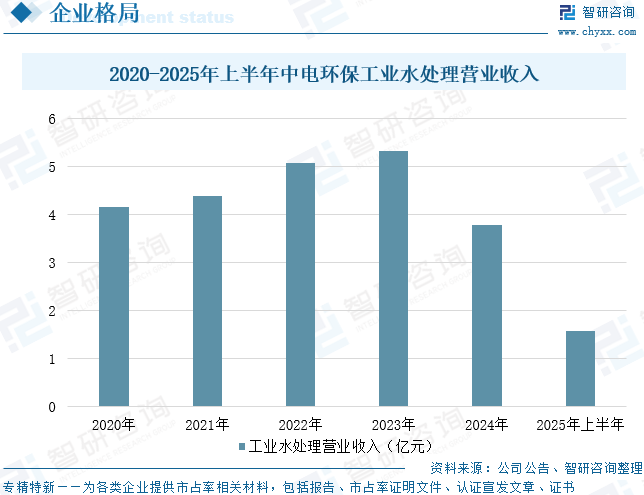 中电环保股份有限公司是生态环境治理服务商,国家级专精特新“小巨人”企业,拥有国家级科技企业孵化器,主营:水务、固危废、烟气治理,包括:工业水处理、城镇污水及水环境治理;固废危废、污泥耦合、土壤修复及餐厨垃圾处理;烟气及VOCs治理;高端装备及智慧环保等。为工业(电力、石化、冶金、新能源、煤矿、建材等)和城镇环保提供系统解决方案,包括:研发设计、核心设备制造、装备系统集成、工程总承包、设施运维和项目投资等。公司经过多年创新发展,形成了“一体两翼”发展格局,一体:水、固、气产业;左翼:发挥创新平台及国家科技企业孵化器功能,加强产学研合作,促进科技成果转化和企业孵化等;右翼:加速资本运营,发挥扬子江环境集团、扬子江环境研究院、创新中心等平台载体作用,联合产业基金,进行产业投资和资本运营;以EP、EPC、BOT、EPCO、设施运维及环保高端装备制造、智慧环保等商业模式,打造了智慧环保系统集成、环保设施运维、创新平台运营三大业态;特色业务包括:废水处理零排放及纳滤膜分离、全膜法水处理、分布式智慧水体/水质净化、污泥干化耦合处理,客户覆盖大工业与市政领域。据统计,2025年上半年,中电环保工业水处理营业收入为1.57亿元,同比增长26.61%。