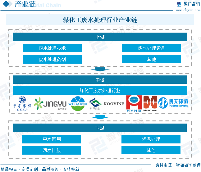 煤化工废水处理产业链上游主要技术和设备制造,涵盖废水处理技术、废水处理设备、废水处理药剂等。产业链中游主要是煤化工废水处理设施的建设与运营,主要包括设备的运营、设备的管理、设备的监管、设备的维护等。产业链下游主要是煤化工废水处理末端市场,主要包括中水回用、污泥处理、污水排放等。