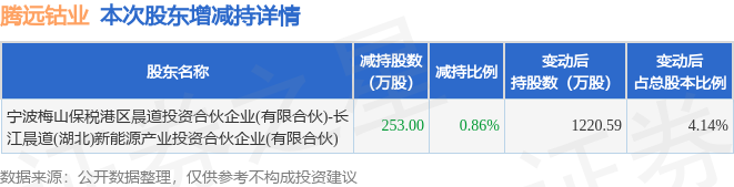 证券之星消息,1月7日腾远钴业发布公告《腾远钴业:关于持股5%以上股东减持股份实施情况暨减持完毕的公告》,其股东宁波梅山保税港区晨道投资合伙企业(有限合伙)-长江晨道(湖北)新能源产业投资合伙企业(有限合伙)于2025年10月17日至2026年1月6日间合计减持253.0万股,占公司目前总股本的0.8584%,变动期间该股股价上涨2.98%,截止1月6日收盘报70.18元。