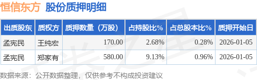 证券之星消息,恒信东方(维权)(300081)1月7日公开信息显示,股东孟宪民向王纯宏、郑家有合计质押750.0万股,占总股本1.24%。质押详情见下表: