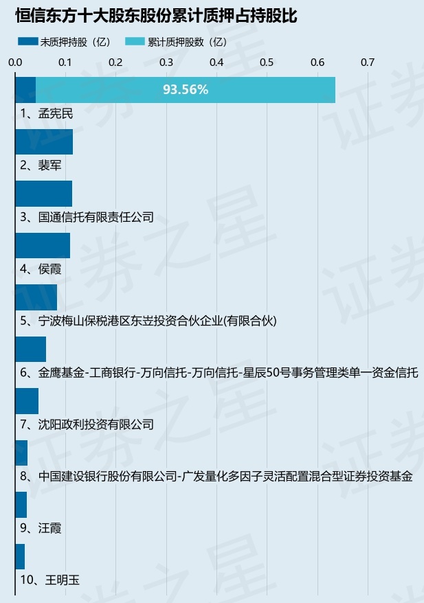 截止本公告日,股东孟宪民已累计质押股份5945.5万股,占其持股总数的93.56%。本次质押后恒信东方十大股东的累计质押股份占持股比例(占持股比例的计算以公司最新一期财务报表公布的十大股东的持股总数为基准)见下图: