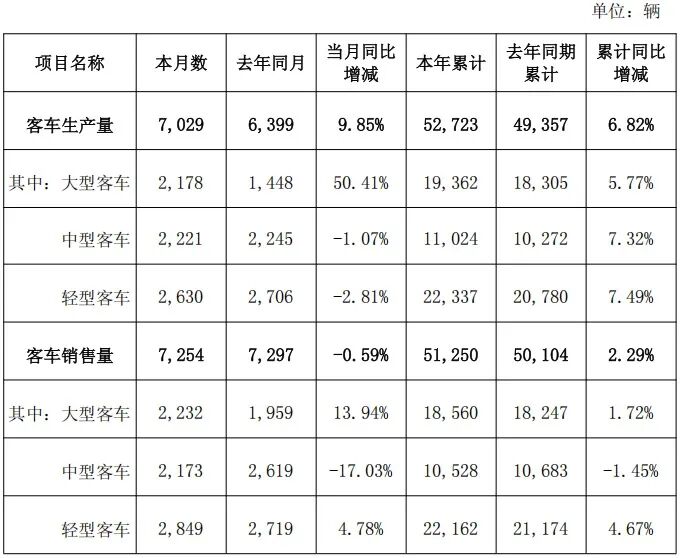 数据显示,2025年12月,金龙汽车客车生产量为7029辆,较去年同月的6399辆同比增长9.85%;当月客车销售量为7254辆,较去年同月的7297辆同比微降0.59%。