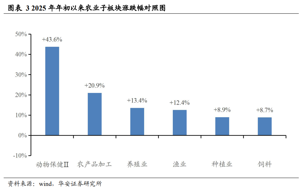 2025 年初至今,农业各子板块涨幅从高到低依次为动物保健Ⅱ(+43.6%)、农产品加工(+20.9%)、养殖业(+13.4%)、渔业(+12.4%)、种植业(+8.9%)、饲料(+8.7%)。