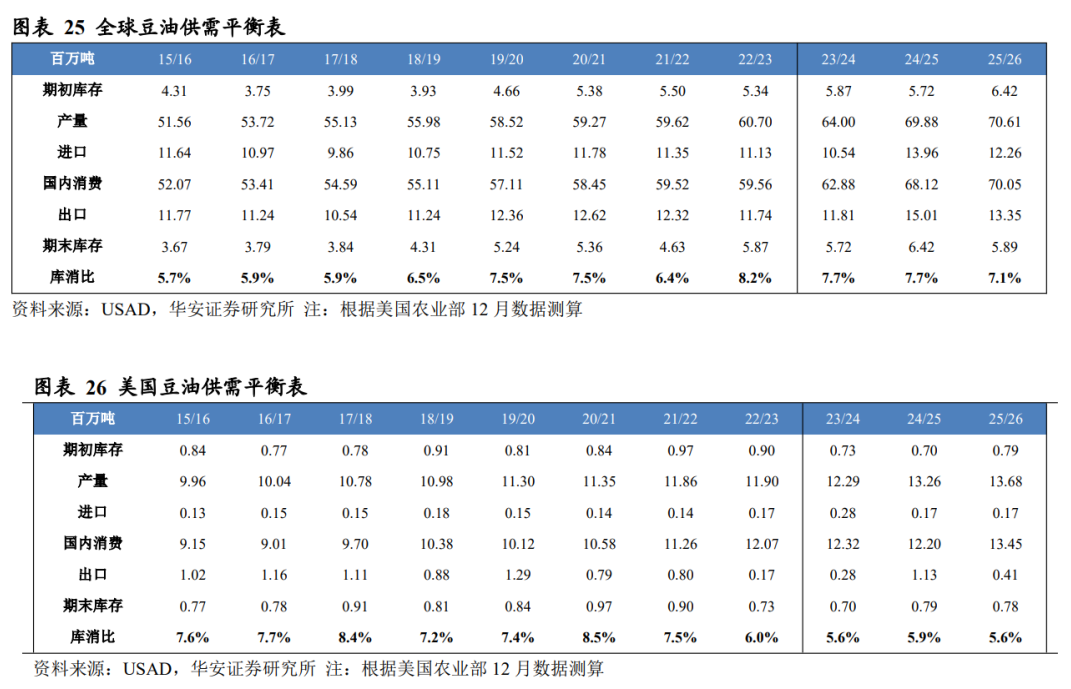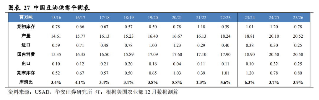 分国别看,2025/26 年度美国豆油产量 1,368 万吨,国内消费量 1,345 万吨,期末库存 78 万吨,库消比 5.6%,库消比预测值较 24/25 年度下降 0.30 个百分点;2025/26年度中国豆油产量 2,052 万吨,国内消费量 2,050 万吨,期末库存 80 万吨,库消比3.9%,较 24/25 年度上升 0.11 个百分点。